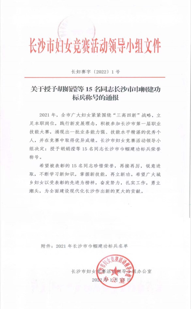长沙商贸旅游职业技术学院湘旅学院酒店管理与数字化运营专业胡鹃滢同学凭借着精湛的专业技能和优秀的职业素养,在长沙市第一届职业技能大赛中脱颖而出,被授予“长沙市巾帼建功标兵”荣誉称号。