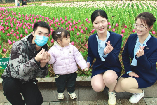 “红色郁金香的花语是热烈的爱意、热情和浪漫。它象征着浓烈的感情,寓意着幸福和喜悦。”蒋心怡以通俗易懂却又生动的语言向游客讲解介绍郁金香。举手投足间尽显课堂锤炼的职业风范。作为学院“现代服务礼仪”课程的实践延伸,6名高乘学子将高铁乘务的“五米微笑、三声应答”准则移植到此次志愿服务中,将敬业精神融入实践。雨丝纷飞中,“高乘蓝”身影与万紫千红的花海相映生辉,热情专业的服务引发游客频频表扬。